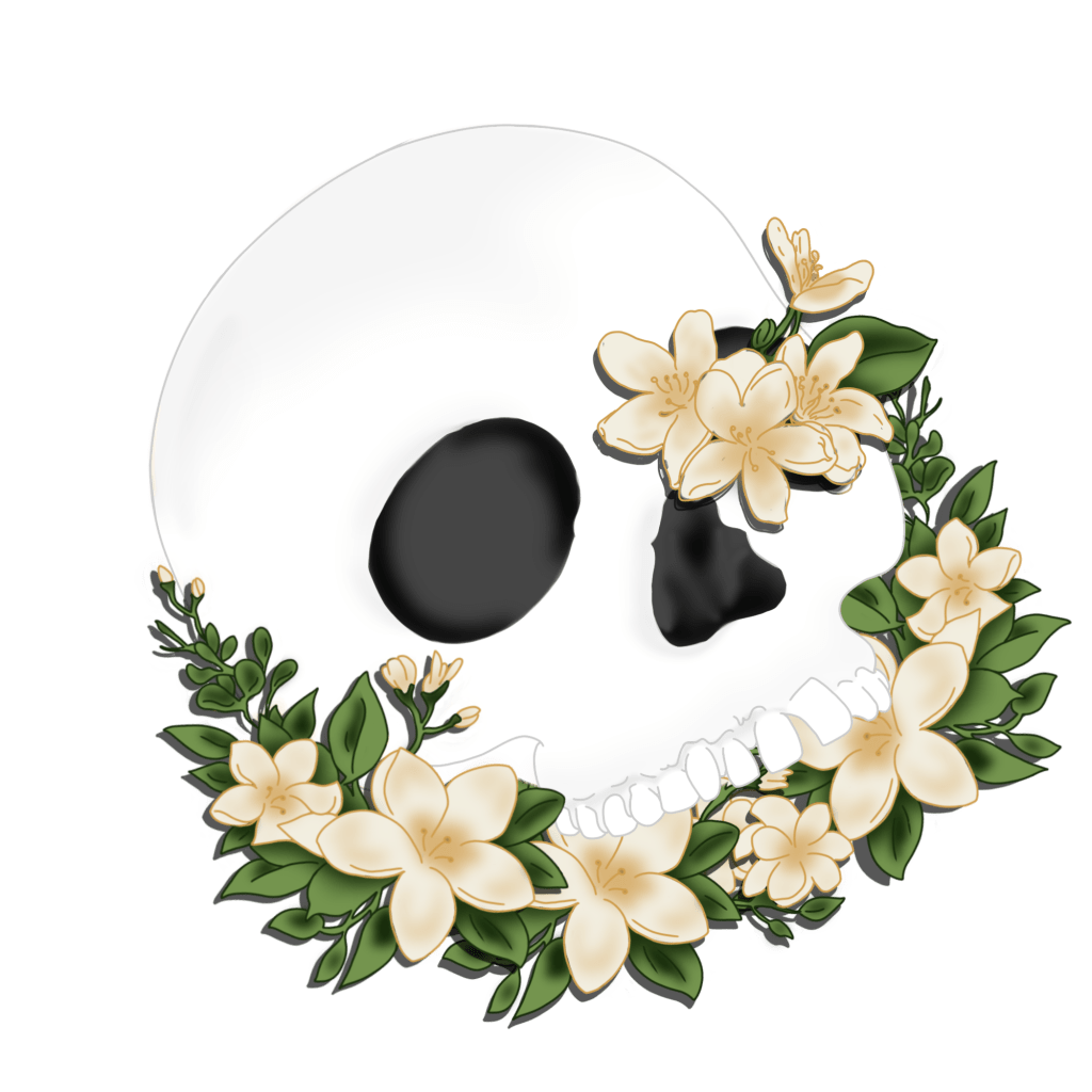 Blinking, she gazes up, searching for a face, but there isn’t one. Only a black mask with a skeletal jawline. The white of the skull is faded and frayed with stains; the newest one is Frenchie’s blood splatter when this mystery man sliced open his throat. Yasmine recoils, but there’s no place for her to go.